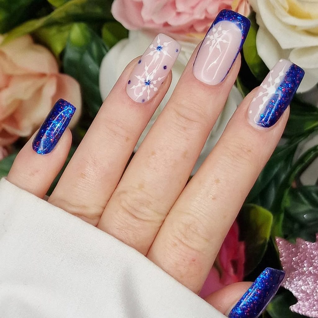 Vibrant and whimsical, these blue glitter nails are a showstopper. The combination of deep blue sparkle and delicate white snowflake designs gives a magical winter wonderland effect. The square shape keeps everything structured, while the glitter finish adds drama and shine.
