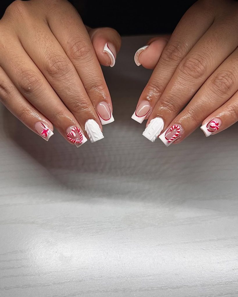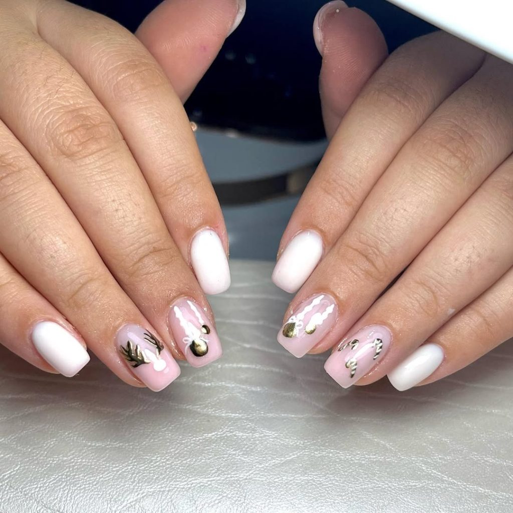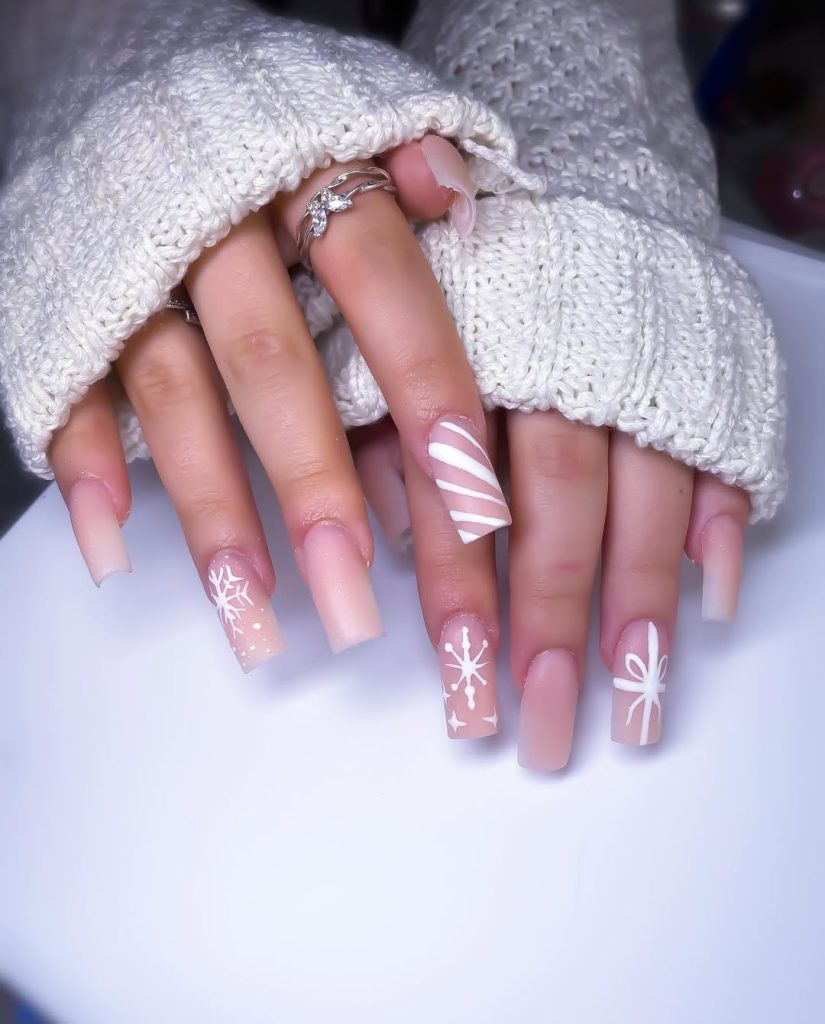 In a delicate fashion and with a playful touch, this set combines a soft nude base with white festive designs that have come straight out of a holiday card: snowflakes, bows, and candy cane stripes. The square proudly keeps things modern, while the soft colors confer a warm, endearing ambiance. This is a manicure that whispers Christmas, perfect for those who enjoy sneak elegance.
