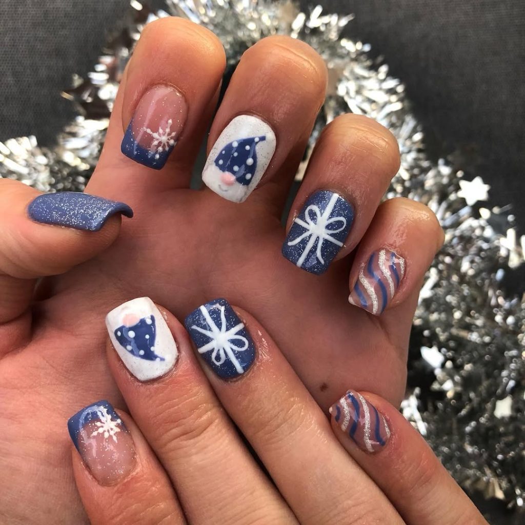 For that quirky additional touch of whimsy, these blue-white nails with gnome art are irresistibly charming. Contrast of gift bows, snowflakes, and wavy stripes strike an equal balance between a storybook winter look that stands out from the sea of reds and greens.