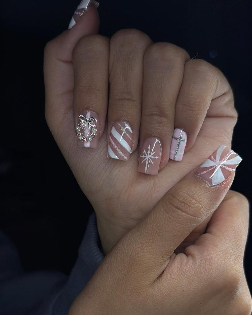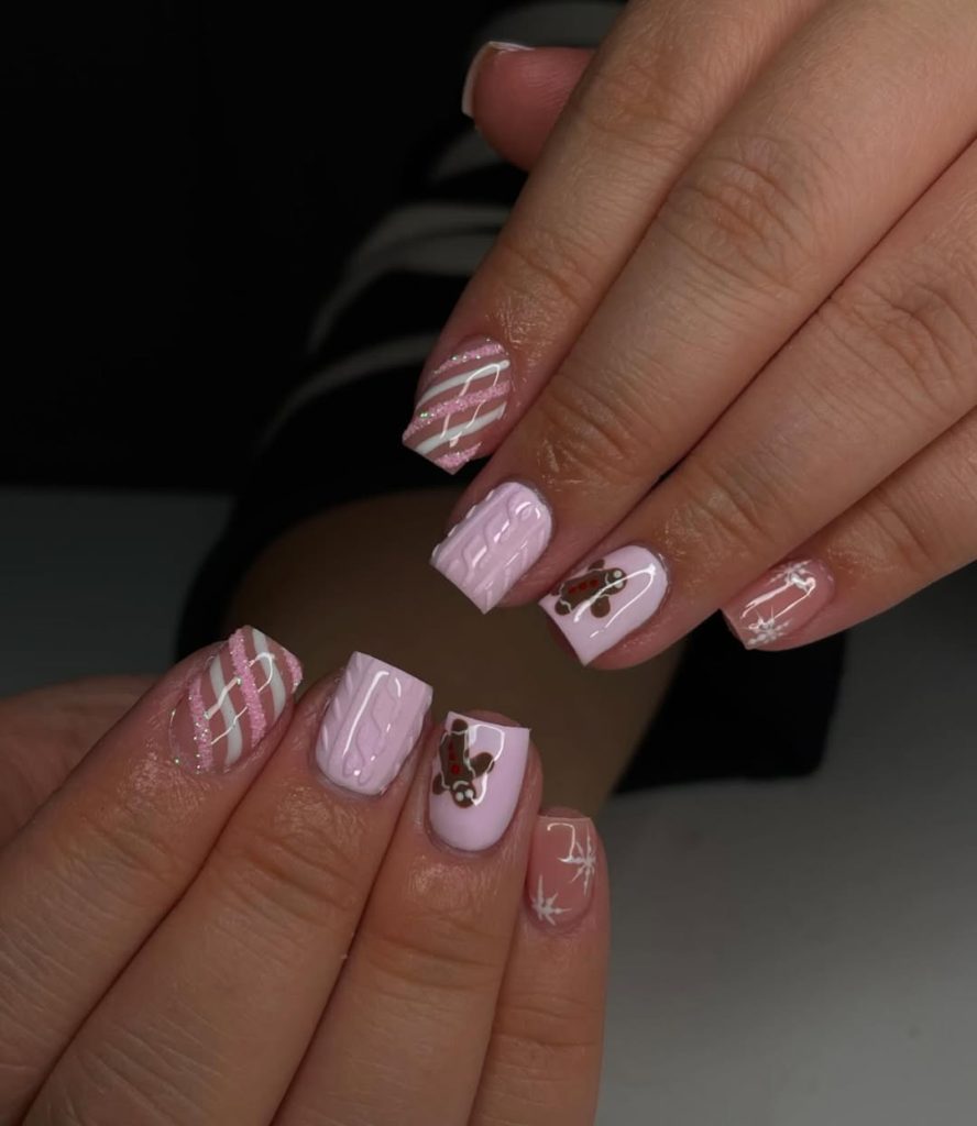 Such nails are simply cute for the holidays. The blush pink base gives a contrast to white stripes, sweater textures, and tiny gingerbread men for a manicure as if walking into a festive bakery. It is cute yet artsy–a great design idea for anybody who loves playful concepts.