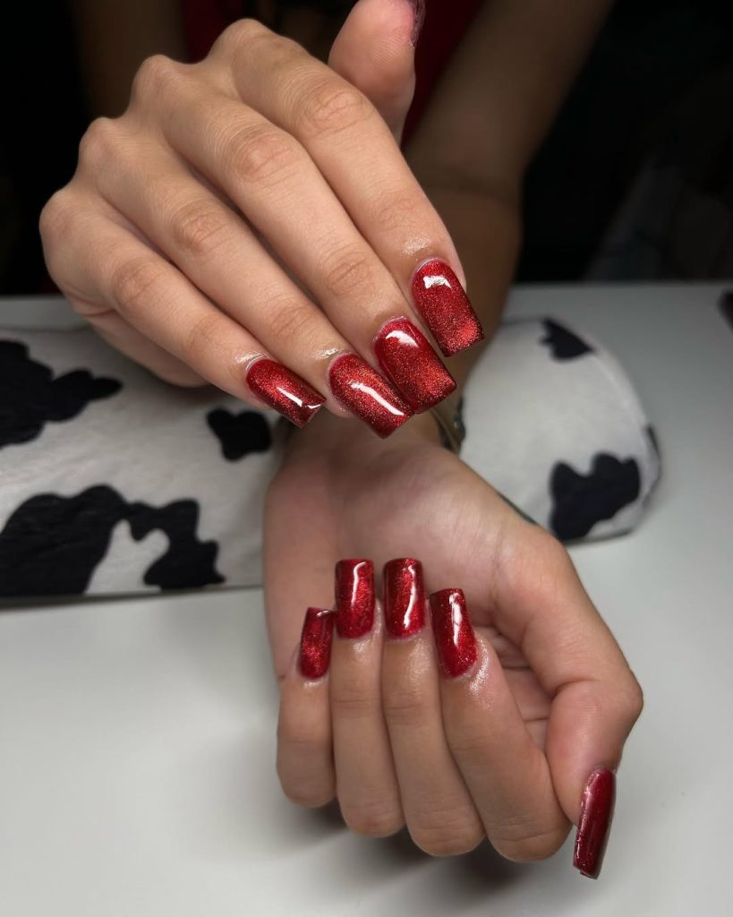 This red square nail design from short to medium length would be right up your alley if you are all for glam nails that don’t require a lot of upkeep. It looks good on most nail types and makes for a quick polish touch-up. Give that designer appeal for the holidays with gold accessories, dark green attire, or a pure red shirt that never goes out of style.
