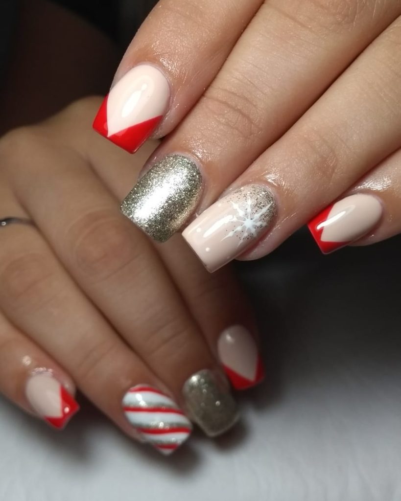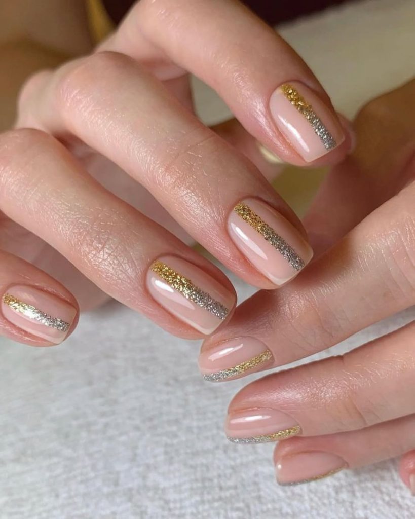 If you want modern and minimal Christmas nails, nude bases with stripes of gold and silver glitter are yours. Subtle yet festive-it catches the light without stealing your shine. It is for the girl who likes her simple with just the right amount of sparkle.
