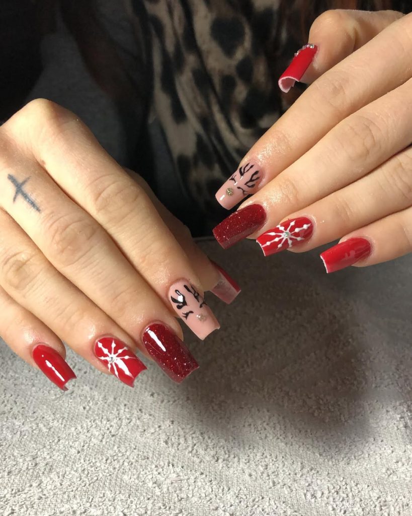 This design blends classic red polish with playful reindeer detailing to produce a manicure that screams festive yet fun. The glittery red shines bright like little ornaments, while the intricate snowflake-dotting and reindeer detailing add a dash of personality.