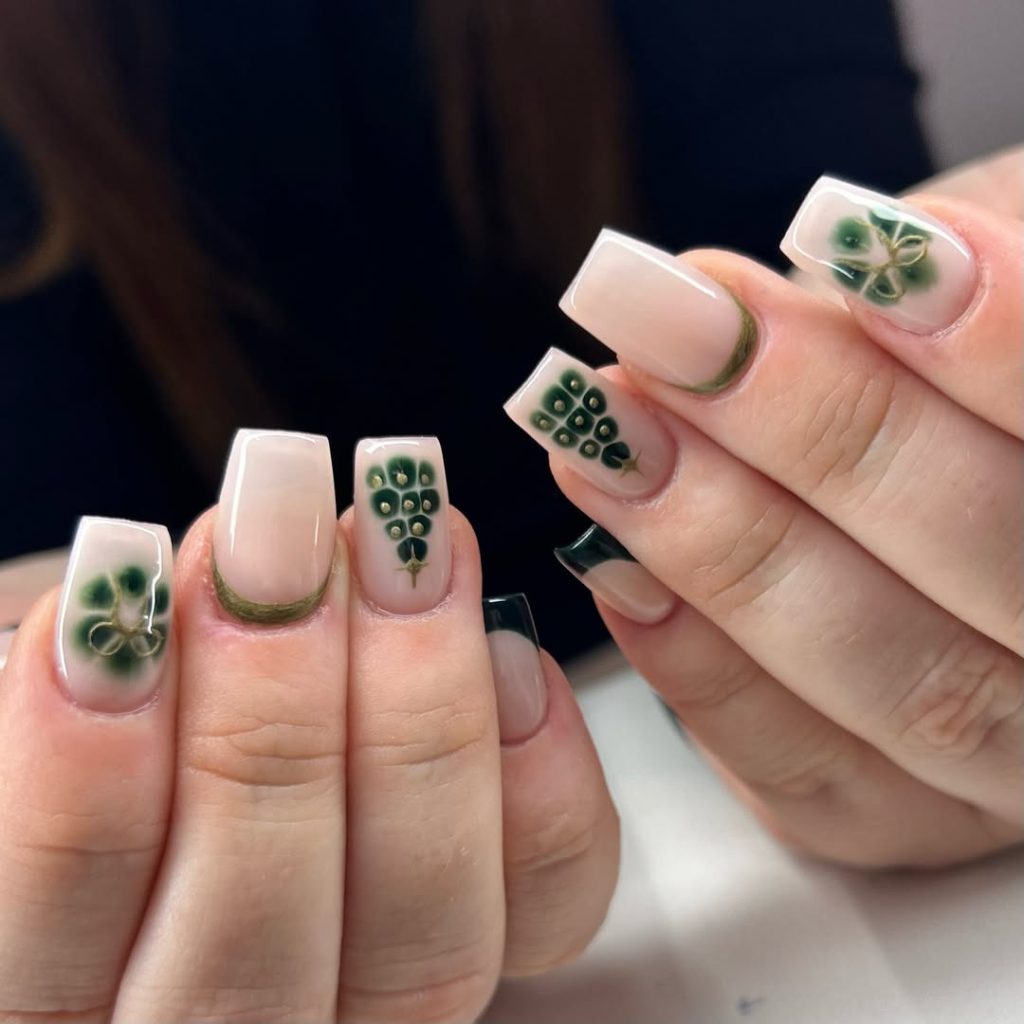 This is your oddball set of holiday nails: soft neutral bases with dark green tree-and-ribbon designs. The minimalist trees feel really artistic and fresh, and therefore very fashion-forward for 2025. It’s festive, but not on the typical red-and-white side.