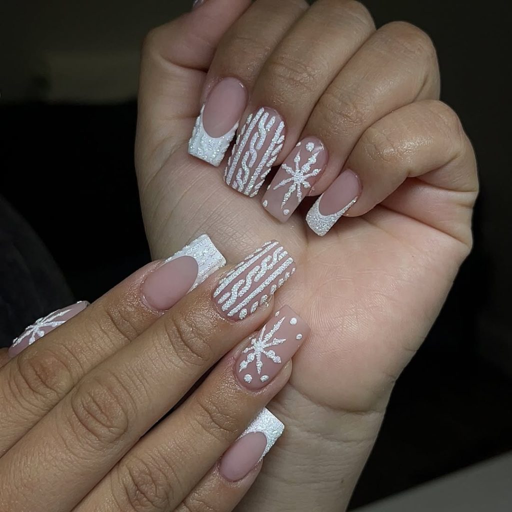 If you love texture, this design is a dream. It combines white glitter tips, cable-knit sweater patterns, and delicate snowflakes for a cozy, wintry look. The matte nude base enhances the frosty details, giving the manicure a soft, elegant finish.