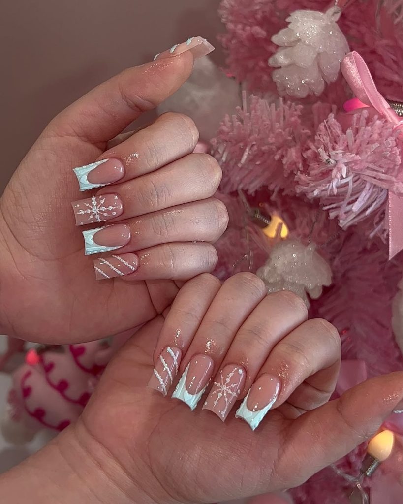 This frosty blue and white design feels like a winter wonderland on your fingertips. The soft blue French tips paired with delicate snowflakes create a fresh, elegant vibe. It’s the kind of manicure that pairs perfectly with crisp winter mornings and twinkling holiday lights.