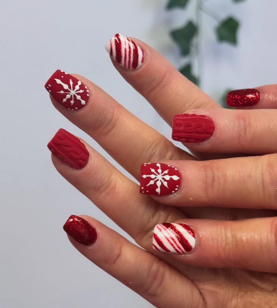 Nothing says Christmas quite like classic red nails — and this design takes it up a notch. The deep red matte and glitter finishes contrast beautifully with intricate white snowflakes and candy cane stripes. The textured sweater knit accents add cozy winter charm, making this set feel like your favorite Christmas jumper turned into nail art.