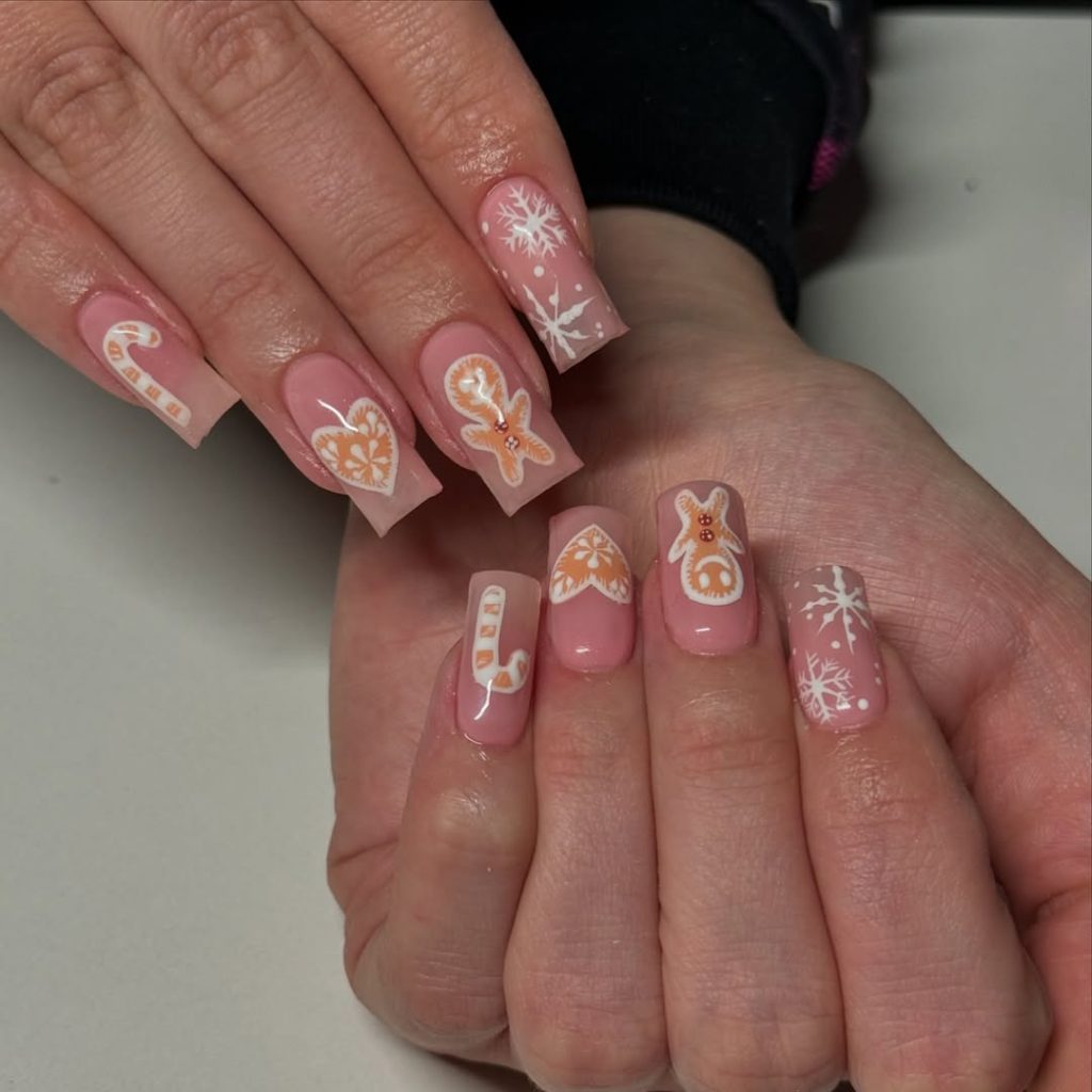 Whimsical and sweet, this nail design feels like stepping into a storybook bakery. The pink base is decorated with gingerbread men, candy canes, snowflakes, and heart motifs in warm white and soft orange tones. It’s cheerful without being loud, offering a cute nod to childhood Christmas memories with a stylish 2025 update.