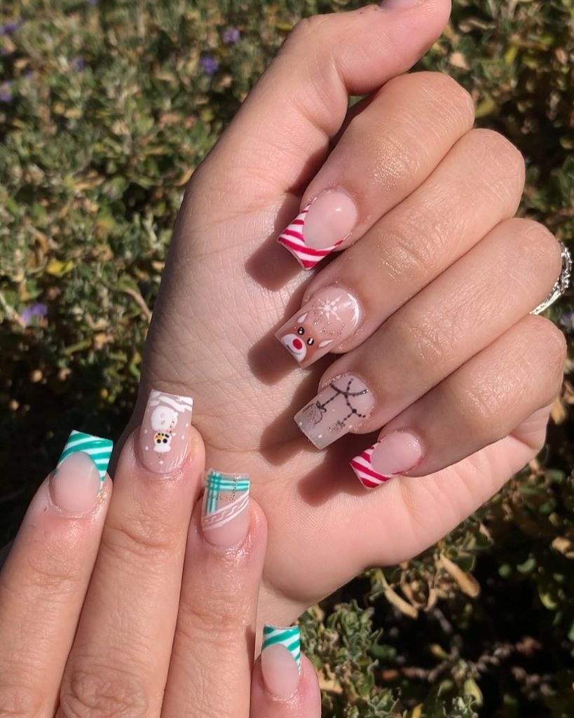 These nails are pure holiday joy. Each square tip tells its own mini story — from candy cane stripes in red and green to a cute Rudolph face and delicate snowflakes. The mix of French tip patterns and fun characters gives a lighthearted vibe that instantly brightens your mood.