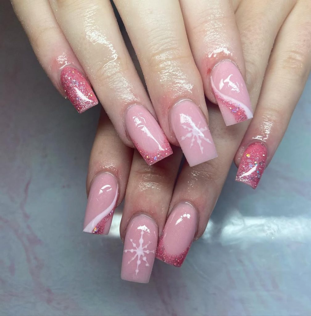 For those who adore a feminine, romantic take on Christmas nails, this set is a dream. The soft pink base is elevated with subtle snowflake designs and delicate glitter gradients on the tips. It’s simple, sparkly, and elegant — like freshly fallen snow glistening under fairy lights.