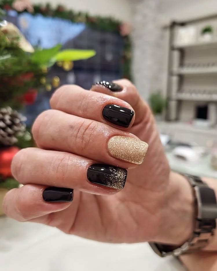 The black and gold combination never loses its elegance and dramatic charm in the festival-Christmas-nail-art scene. The glossy black polish pairs with gold glitter for an effect that’s at once elegant and festive. The contrast is bold, making those square nails an attention-grabbing focal point in any holiday dying.