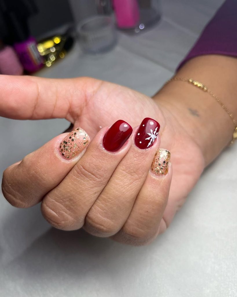 Red and gold glitter in the right company: equally festive and sassy. The red nails deliver warmth and energy, while the gold glitter spits sparkle, almost as if the lights were actually so beautiful that they could be touched. One snowflake is enough to keep everything in check, and it is certainly a win-win.