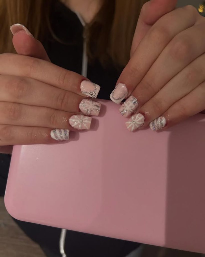 Sweet and frosty, this pink and white design feels like unwrapping presents on a snowy morning. Each nail has its own festive charm—bows, snowflakes, candy stripes, and delicate silver glitter. The soft pink base gives the manicure a cute and romantic vibe, perfect for anyone who loves a playful twist on traditional holiday colors.
