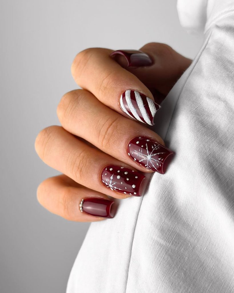 These deep burgundy nails are a moody and stylish option for winter. With silver candy stripes, dotted snowflakes, and delicate details, they feel festive without being loud. The square shape enhances the clean design, making the manicure look sleek and modern.