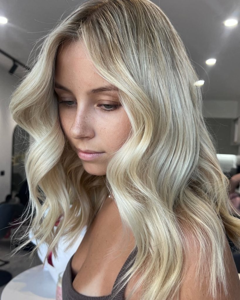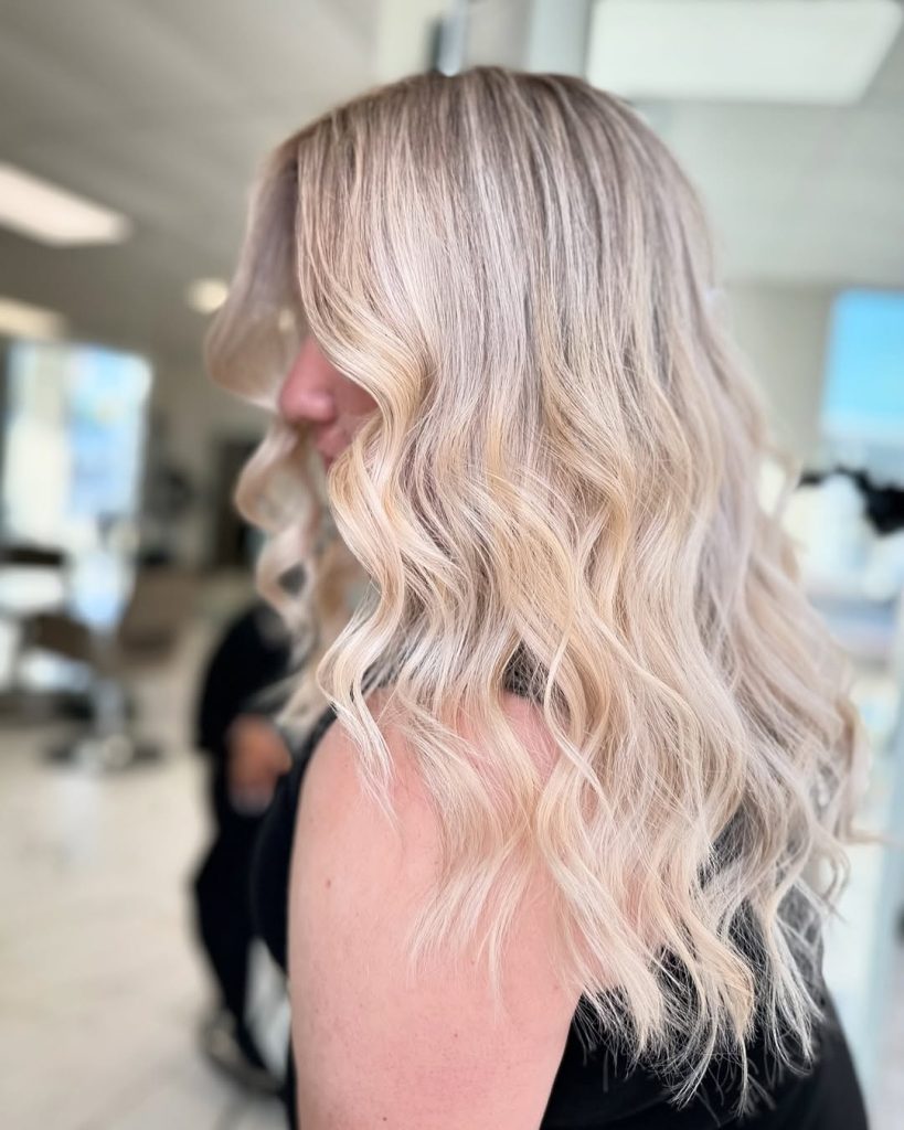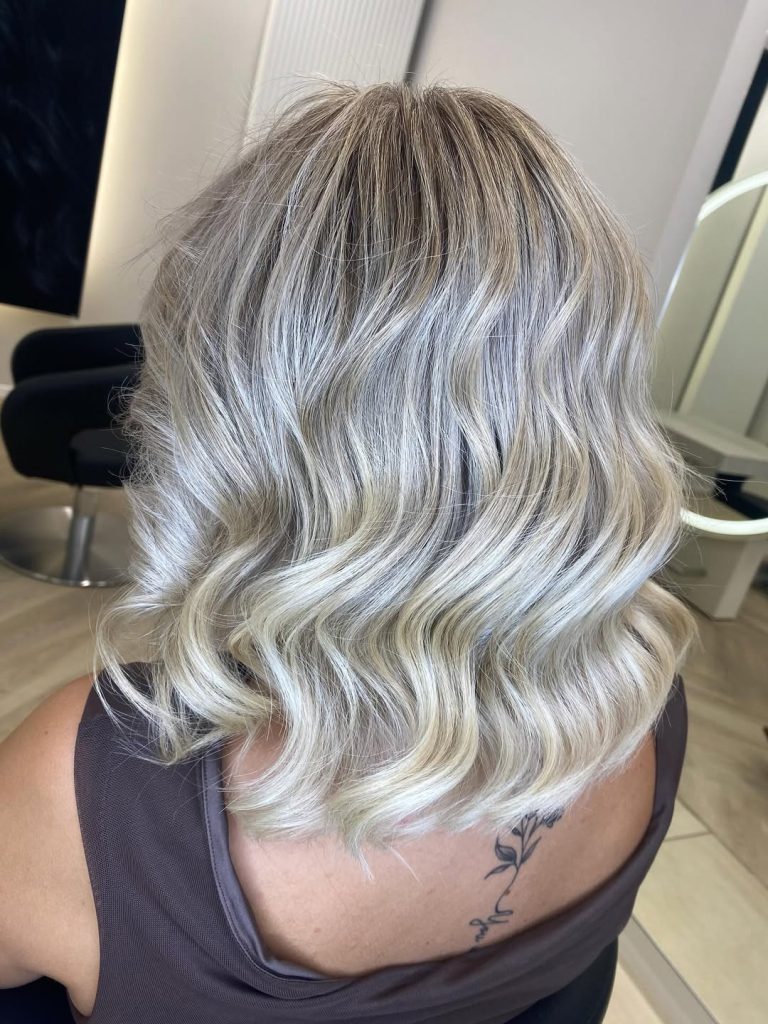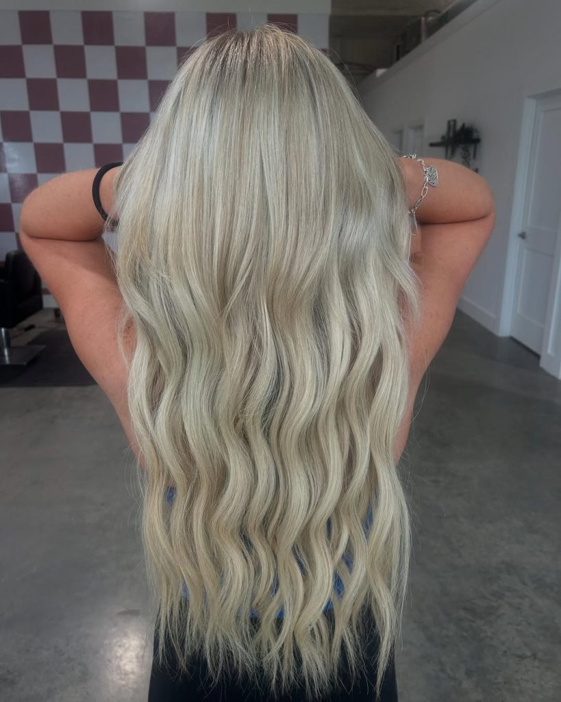 There’s something striking about this cool-toned blonde that instantly draws attention. The blend of ash and neutral highlights creates depth and contrast while still maintaining a soft, wearable finish. It’s bold without being too dramatic.