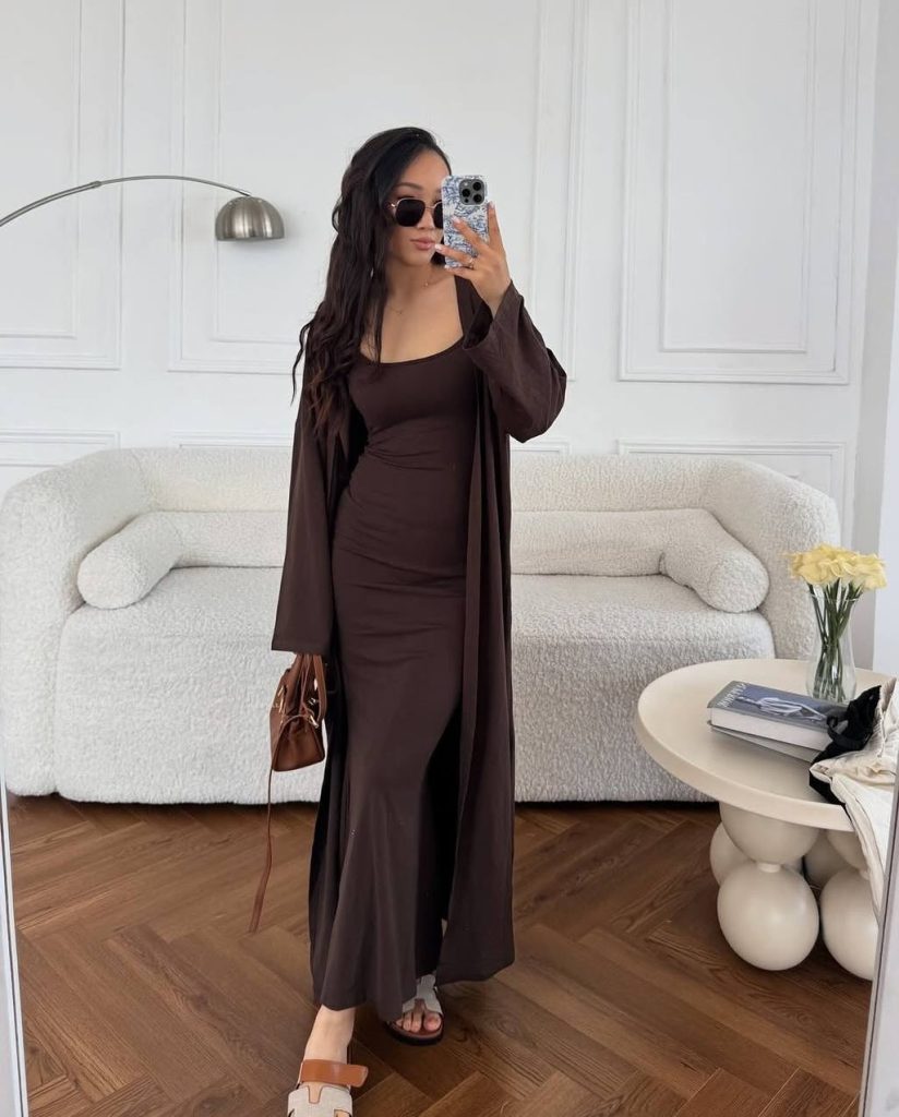 A sleek Brown Maxi set with layering creates a refined yet polished casual summer Outfit.