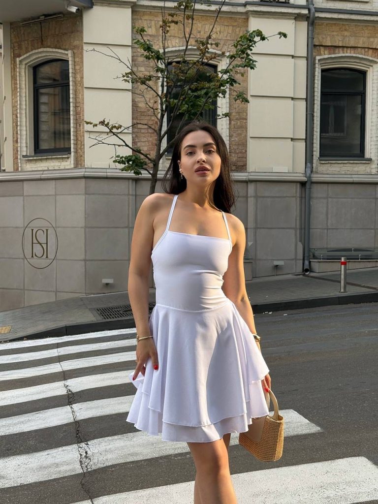 A flirty white short dress with ruffles and patterns balances softness with a polished, cute aesthetic.