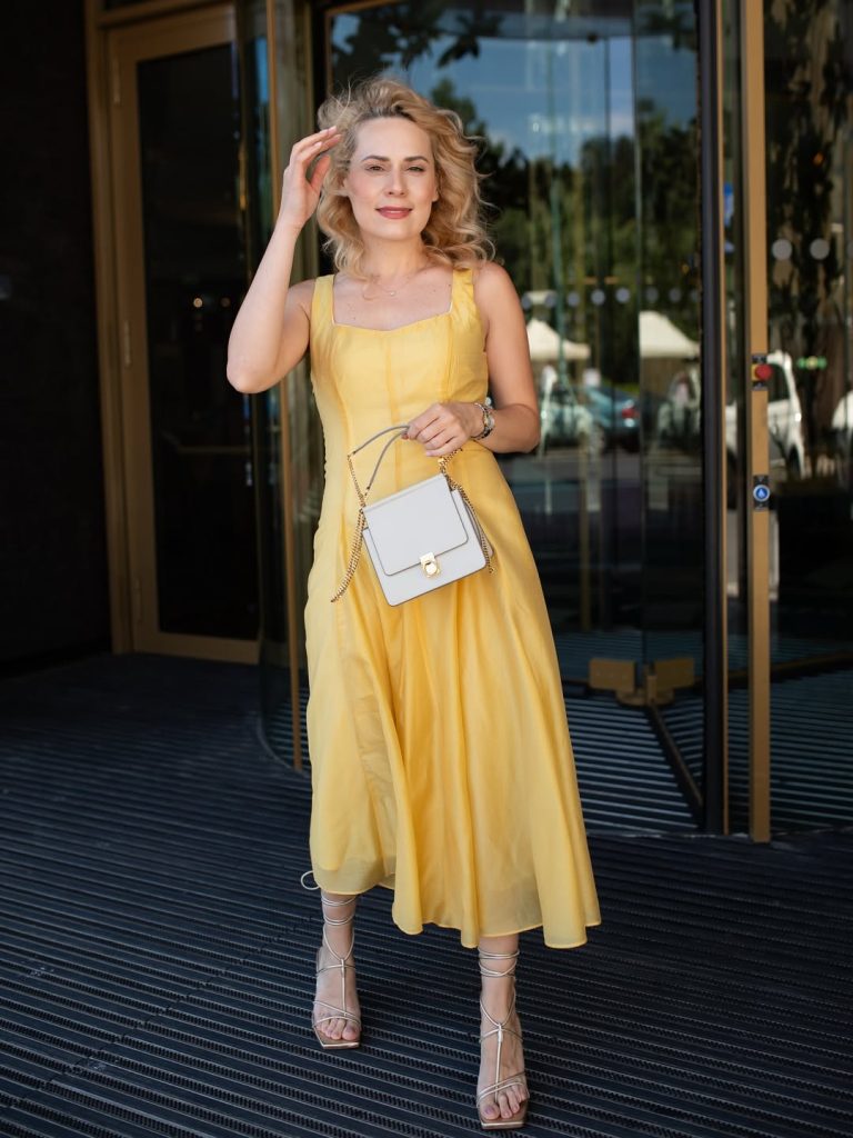 A light Yellow shortdress paired with sneakers brings together comfort and playful summer ease.