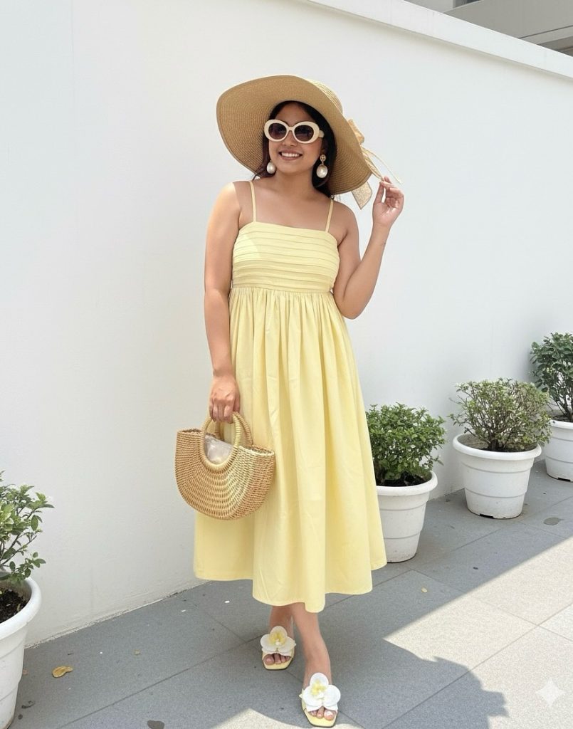 A light Yellow Maxi/Midi sundress paired with summer accessories creates an effortless, sun-ready Aesthetic.
