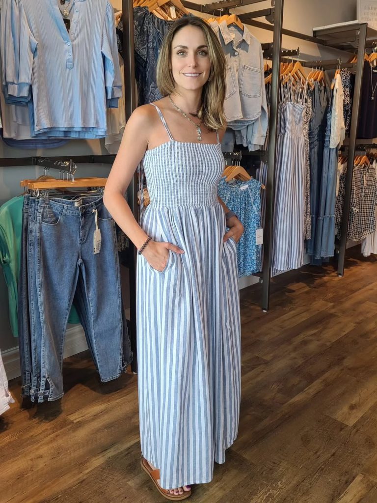 A relaxed Striped Maxi dress blends comfort and practicality with an effortlessly Casual summer vibe.