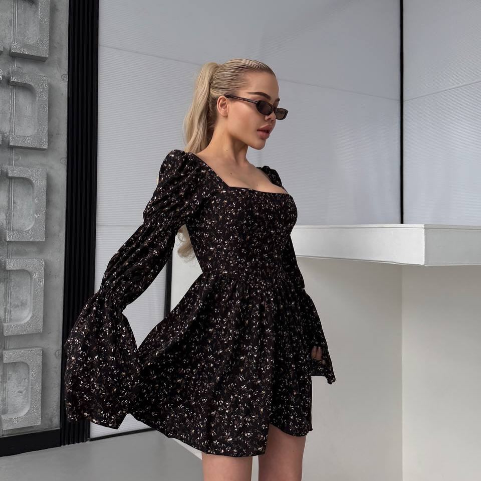 A delicate black short dress with soft floral patterns brings a quiet, feminine elegance to everyday styling.