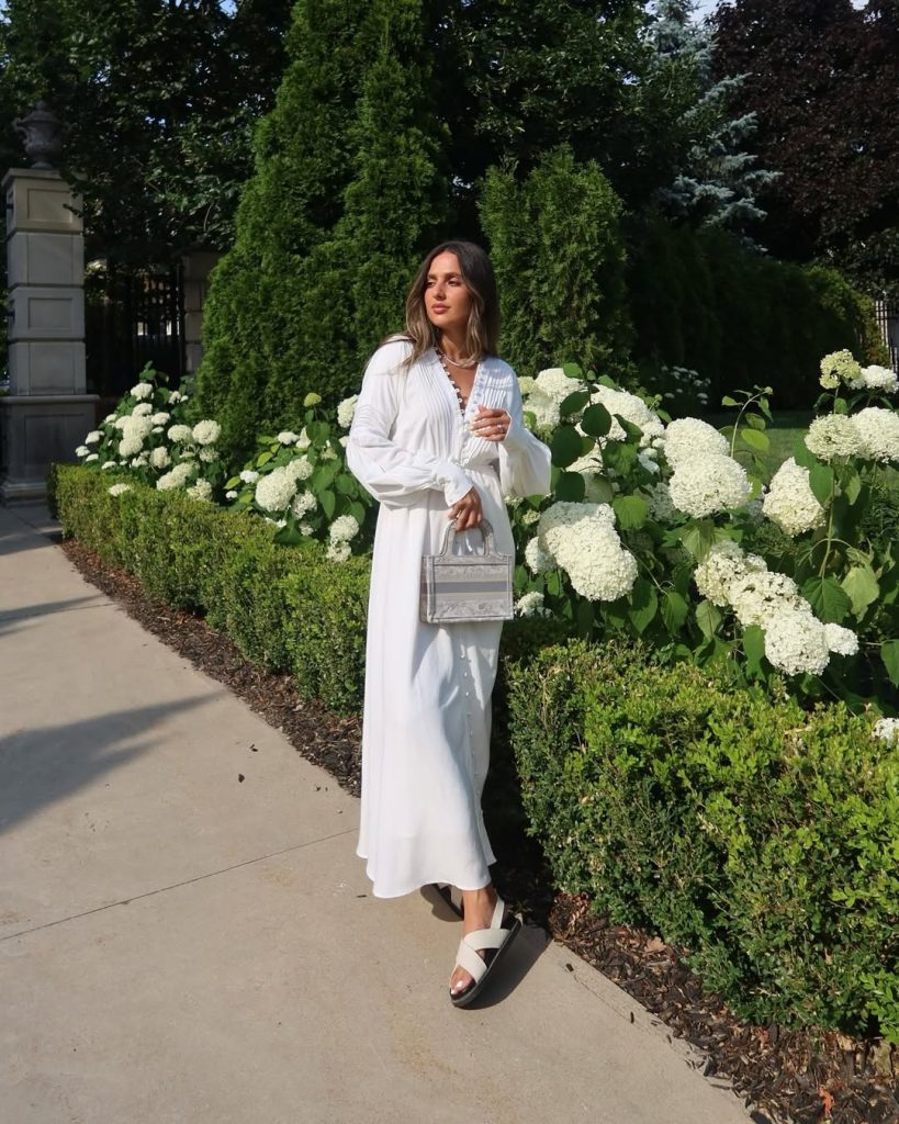 A flowing white dress with long sleeves captures grace and Hijab dress aesthetics in a modern, wearable way.