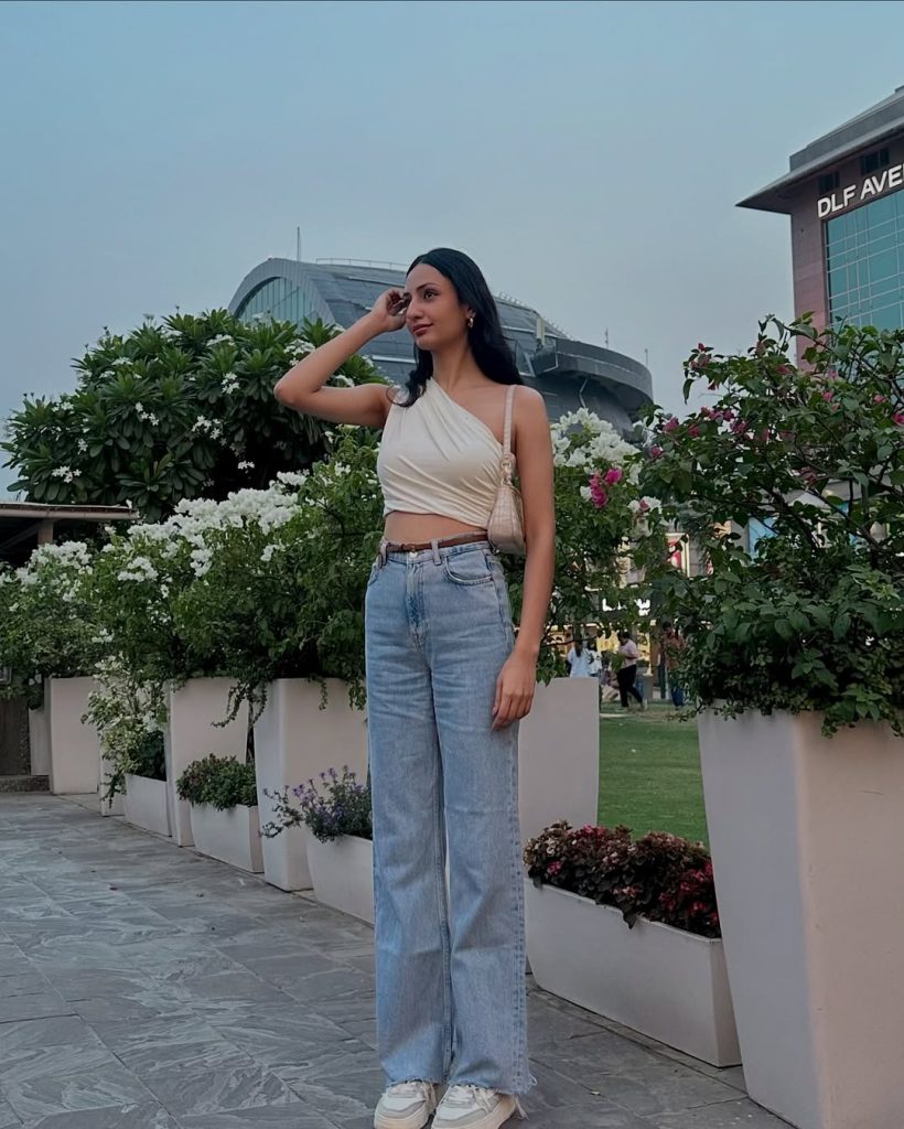 A sleek asymmetrical top paired with denim creates a modern, balanced outfit with a subtle edge.