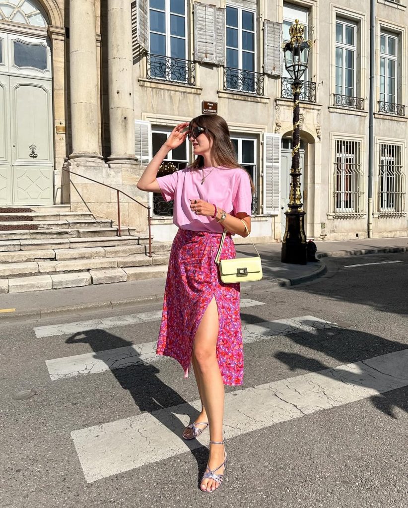 24. Pink Tee with Printed Wrap Midi Skirt