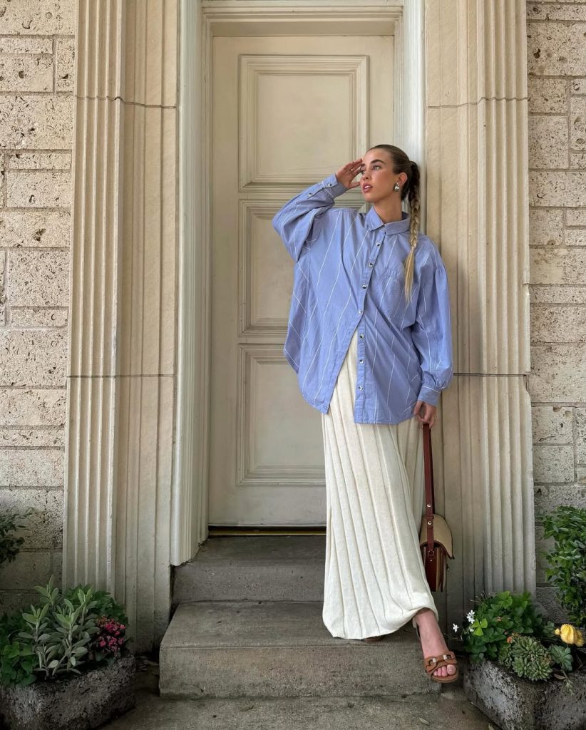 An oversized shirt paired with a flowing skirt delivers a refined yet Modest and breathable summer silhouette.