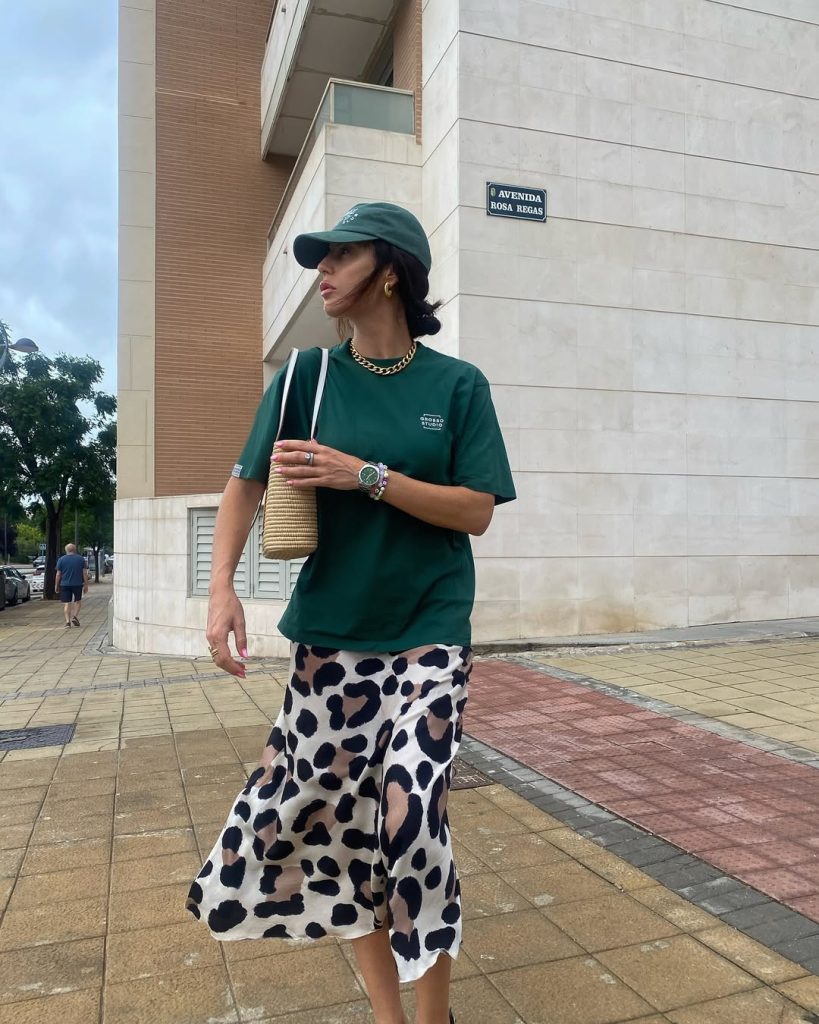 8. Sporty Green Tee with Leopard Midi Skirt