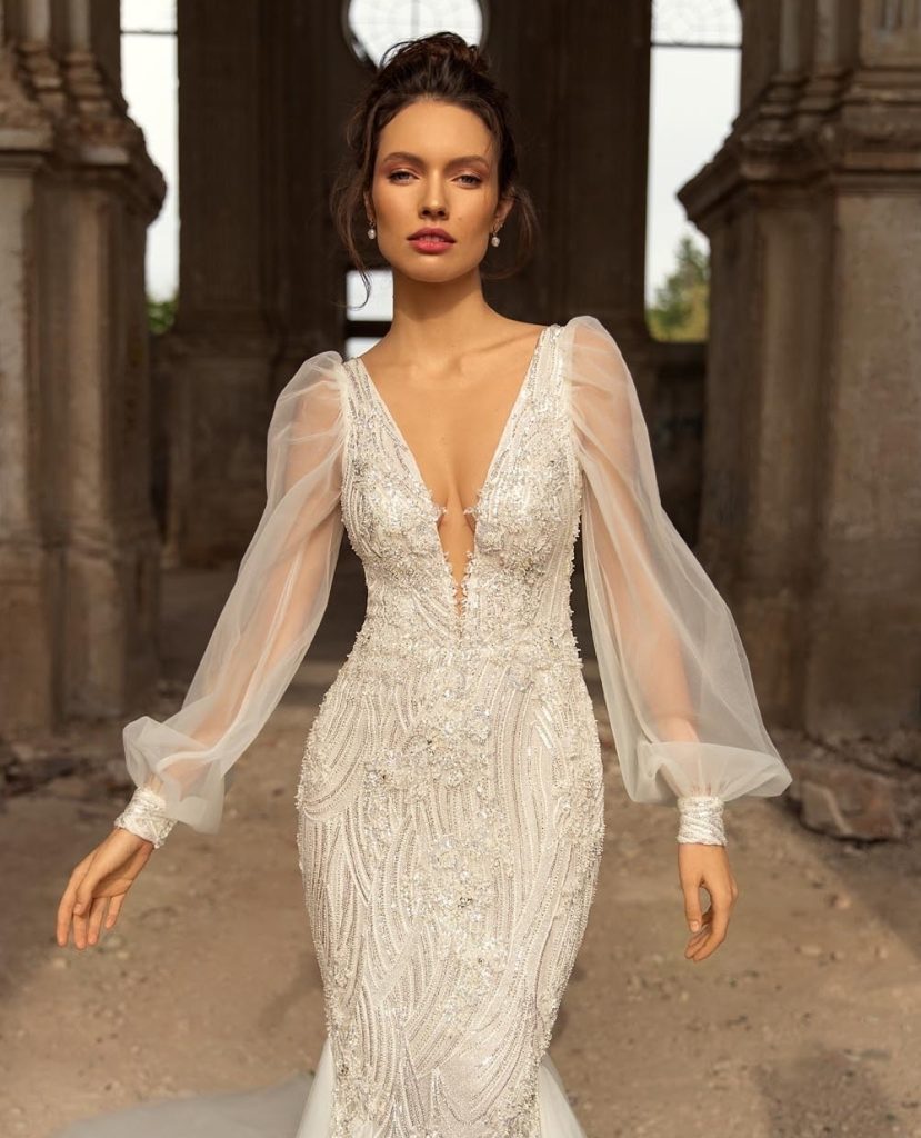 A deep plunging neckline balanced by sheer structured sleeves creates a confident and elegant bridal statement.