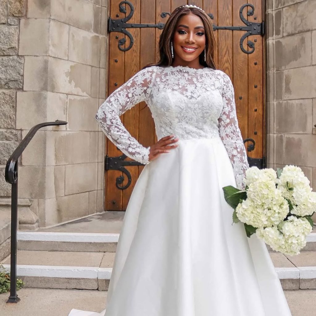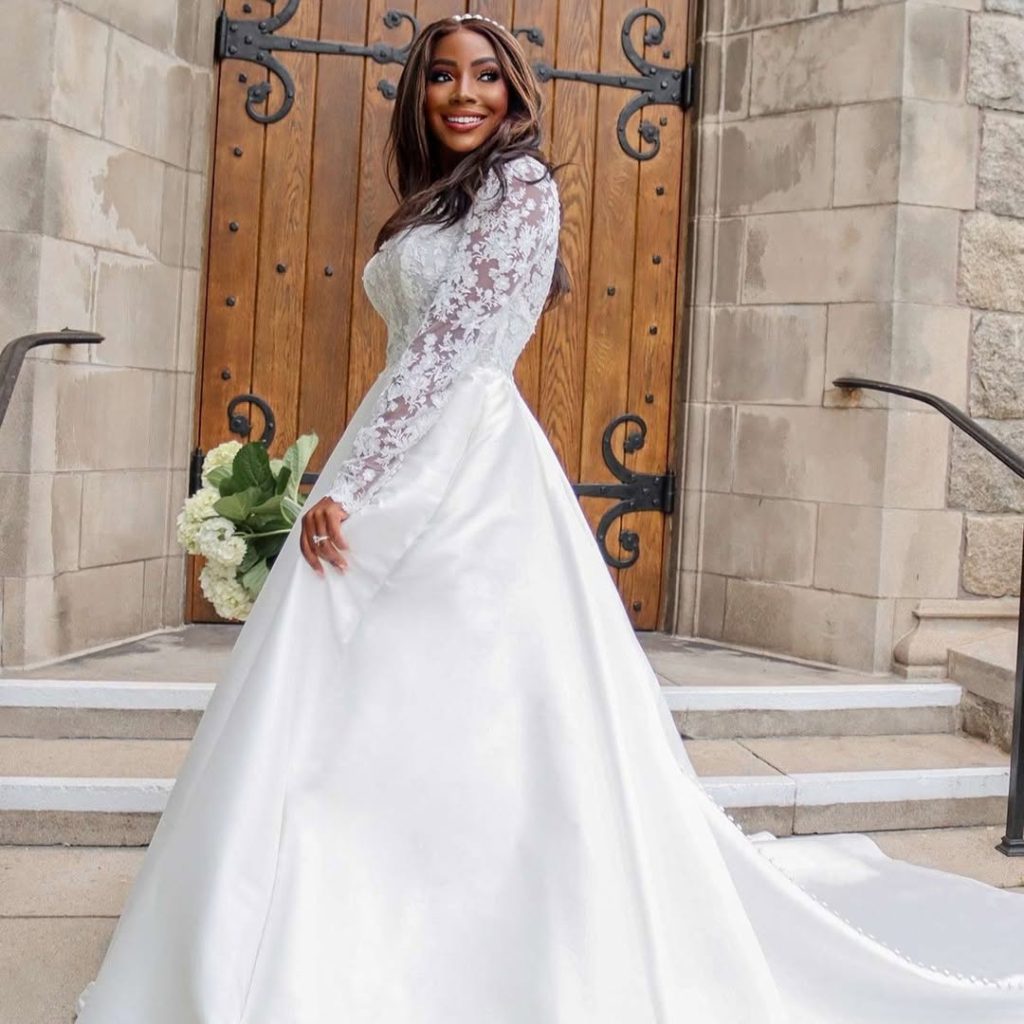 Long lace sleeves paired with a structured skirt create a confident, regal bridal look that photographs beautifully from every angle.