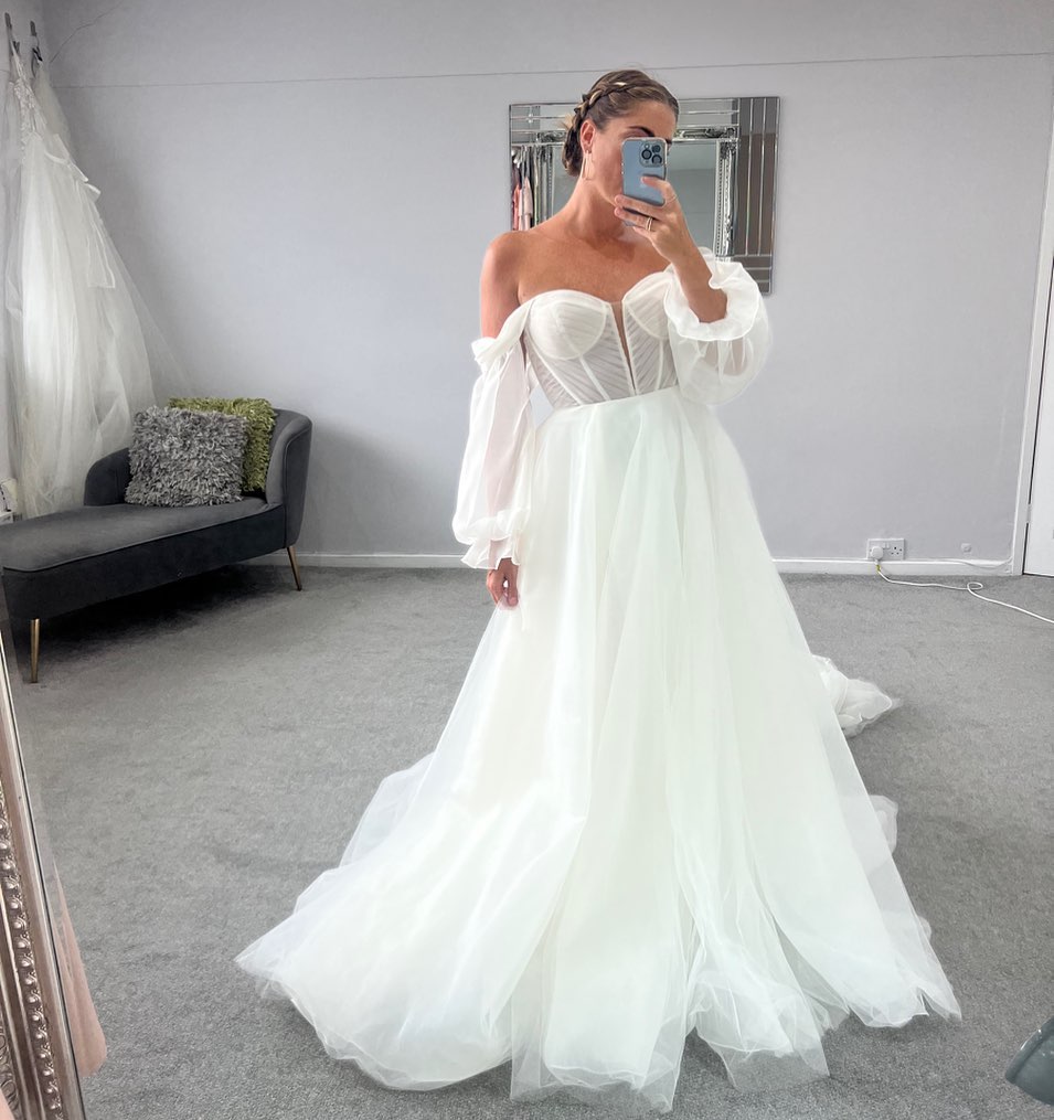 - Off-the-shoulder tulle sleeves with soft gathers