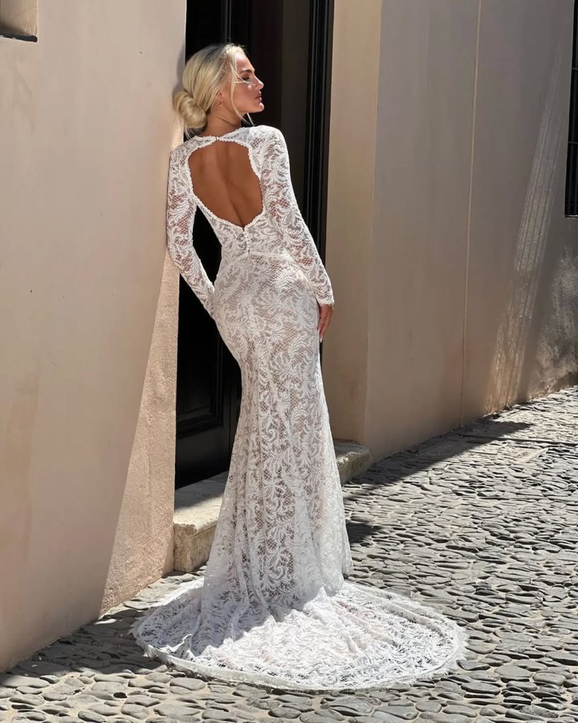 A striking open back redefines what a wedding dress with sleeves can be in 2026. From the front, it whispers refinement; from the back, it makes a statement that lingers.