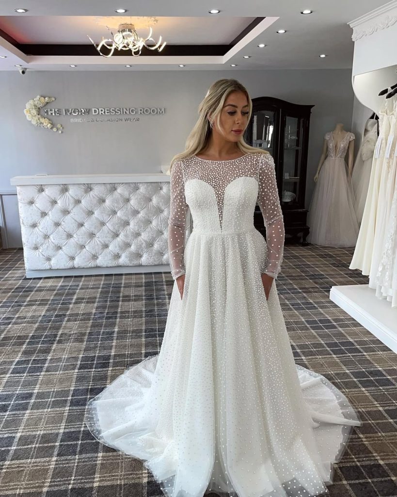 This gown captures light in the most understated way. Tiny dotted textures across sheer sleeves and bodice create depth without overwhelming the eye.
