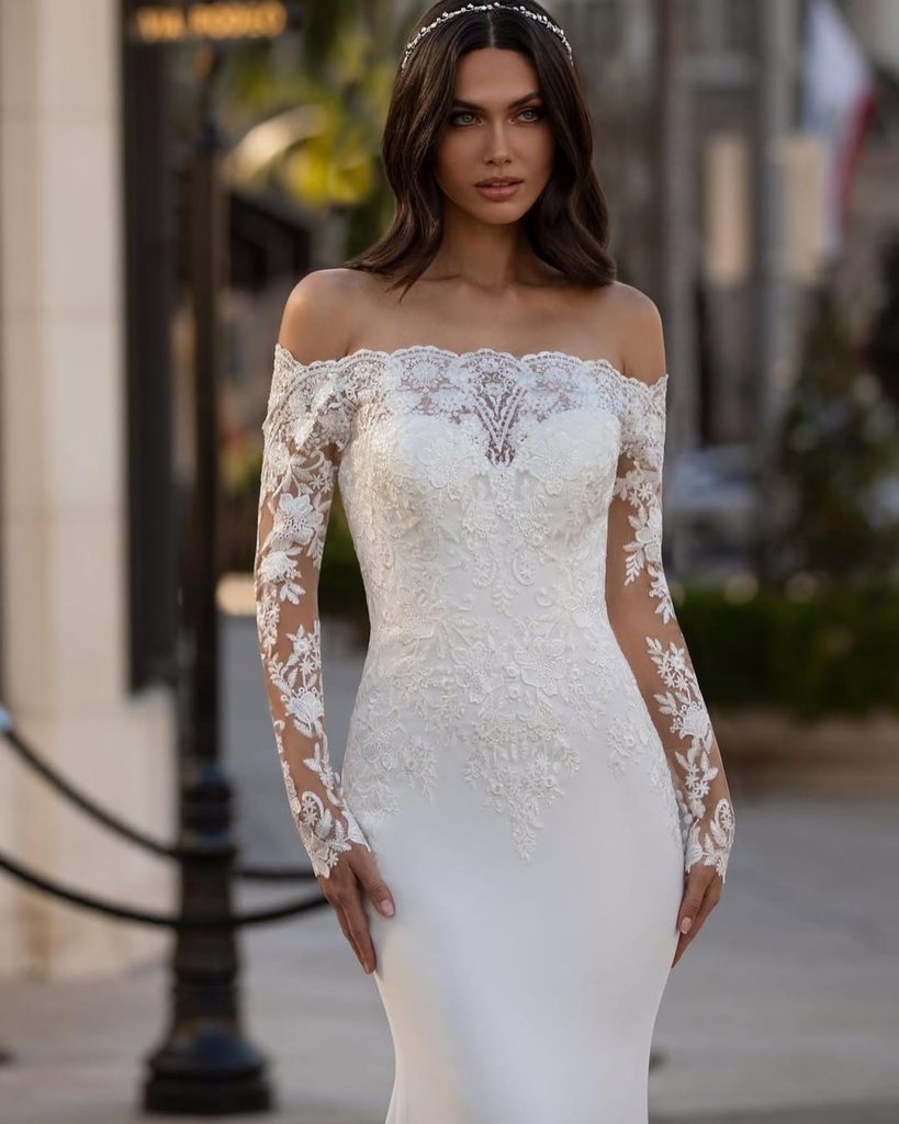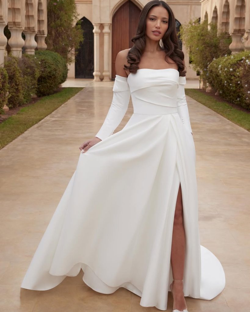 - Wedding dress with off-the-shoulder long sleeves