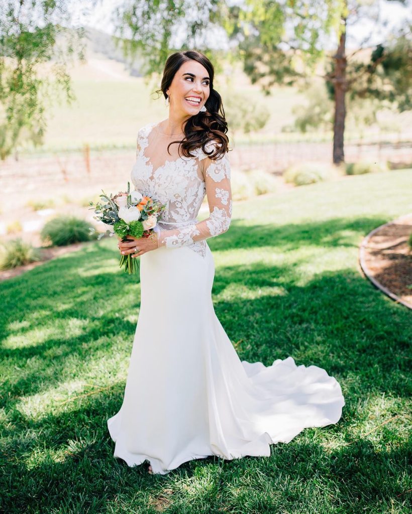Lace sleeves and a fitted silhouette offer a modern, confident, and stylish architectural aesthetic to wedding dresses with sleeves.