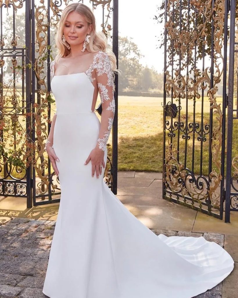 - Wedding dress with fitted lace sleeves