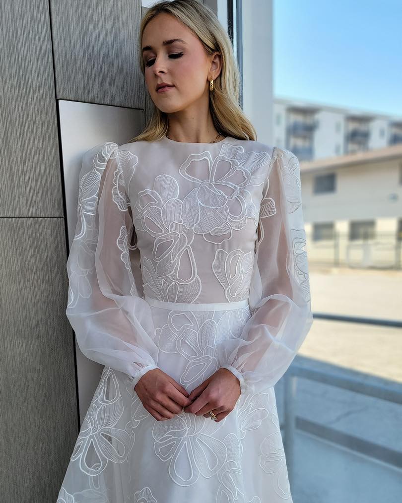 Here, romance takes on a lighter, more effortless tone. Floral lace sleeves float gently against the skin, offering a look that feels tender without drifting into tradition-heavy territory.
