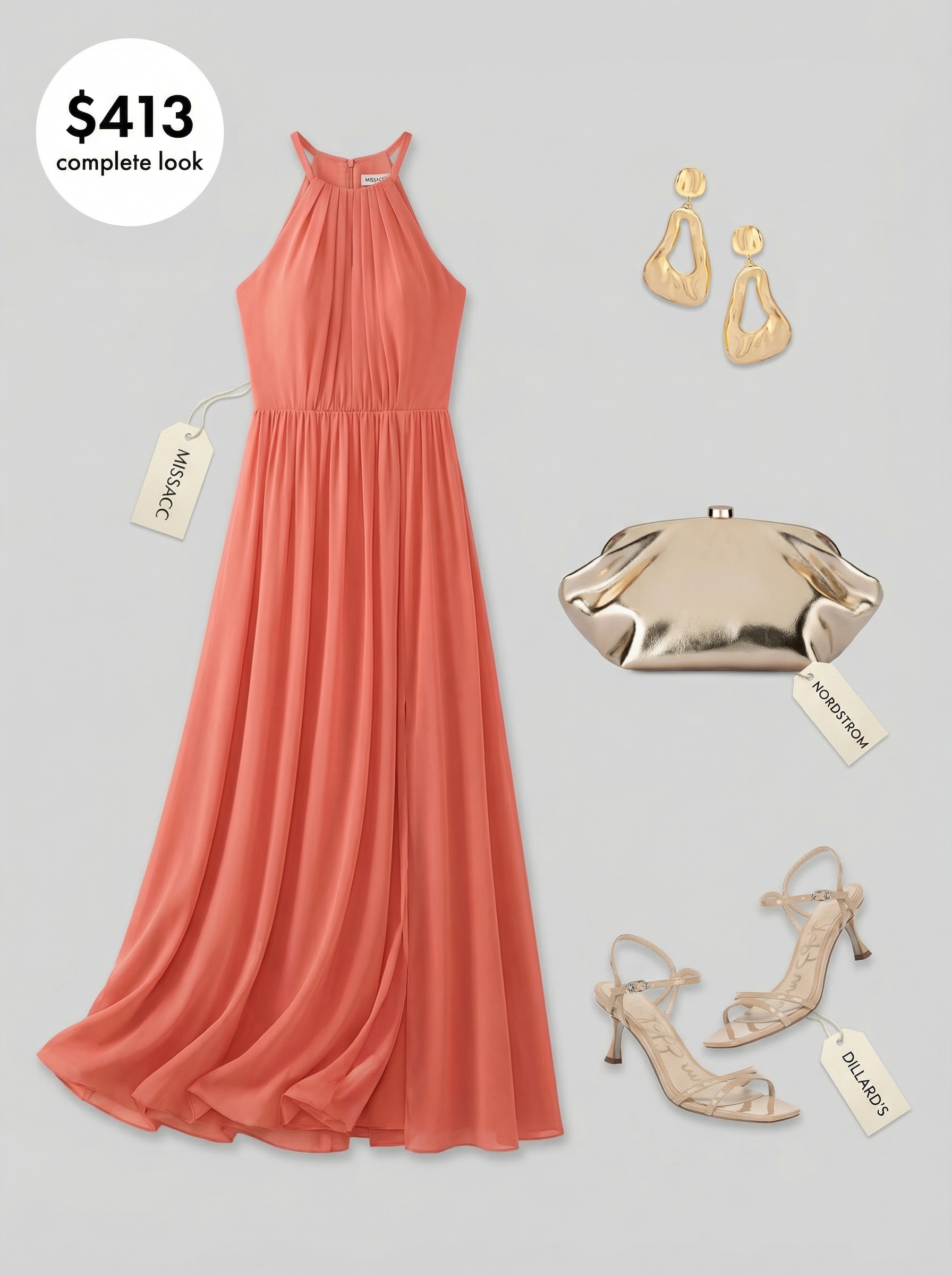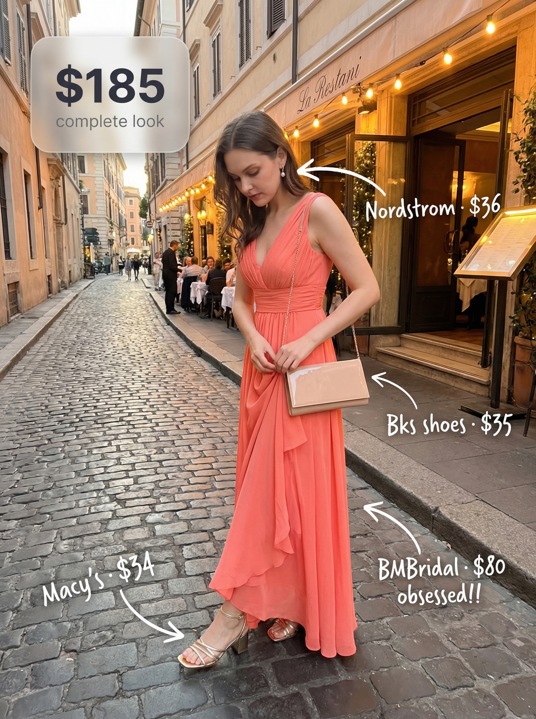 But for a getaway, this look is perfect for a resort evening. The centerpiece is a floor-length chiffon dress ($119) in a stunning vibrant coral, whose halter neckline and pleated skirt create beautiful, flowing movement with every step. In our test, the lightweight chiffon fabric felt incredibly airy and breathable through a four-hour outdoor dinner in 85°F heat. Nude patent leather heels ($139.99) elongate the legs, while a glamorous gold clutch ($99) elevates the look. This ensemble is a prime example of the aspirational yet achievable old money summer outfits women are searching for, combining a bold color with a classic, elegant silhouette.