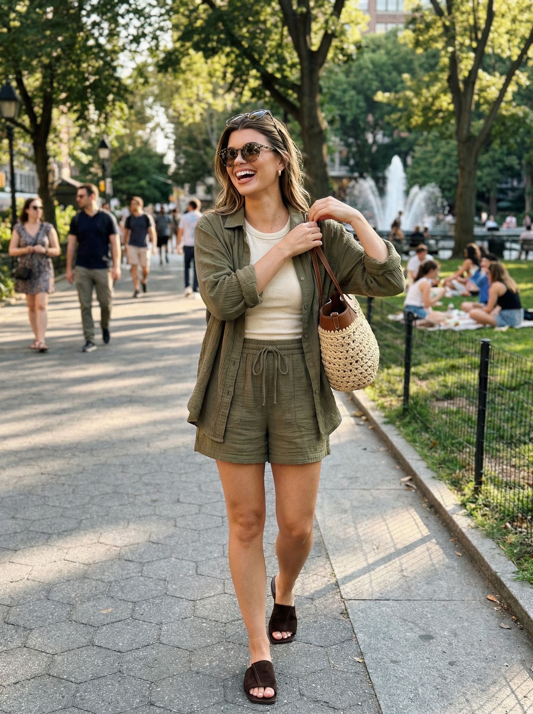 In our test, the linen fabric was buttery soft and wasn’t see-through, even when worn in direct sunlight, confirming its quality. The shirt’s versatility allows it to be worn open for a breezy feel or buttoned for a more put-together look. Verdict: This cohesive outfit perfectly captures the ‘comfortable chic’ mood. Its aspirational yet achievable combination of olive, cream, and brown makes it a highly repinnable style for any summer weekend.