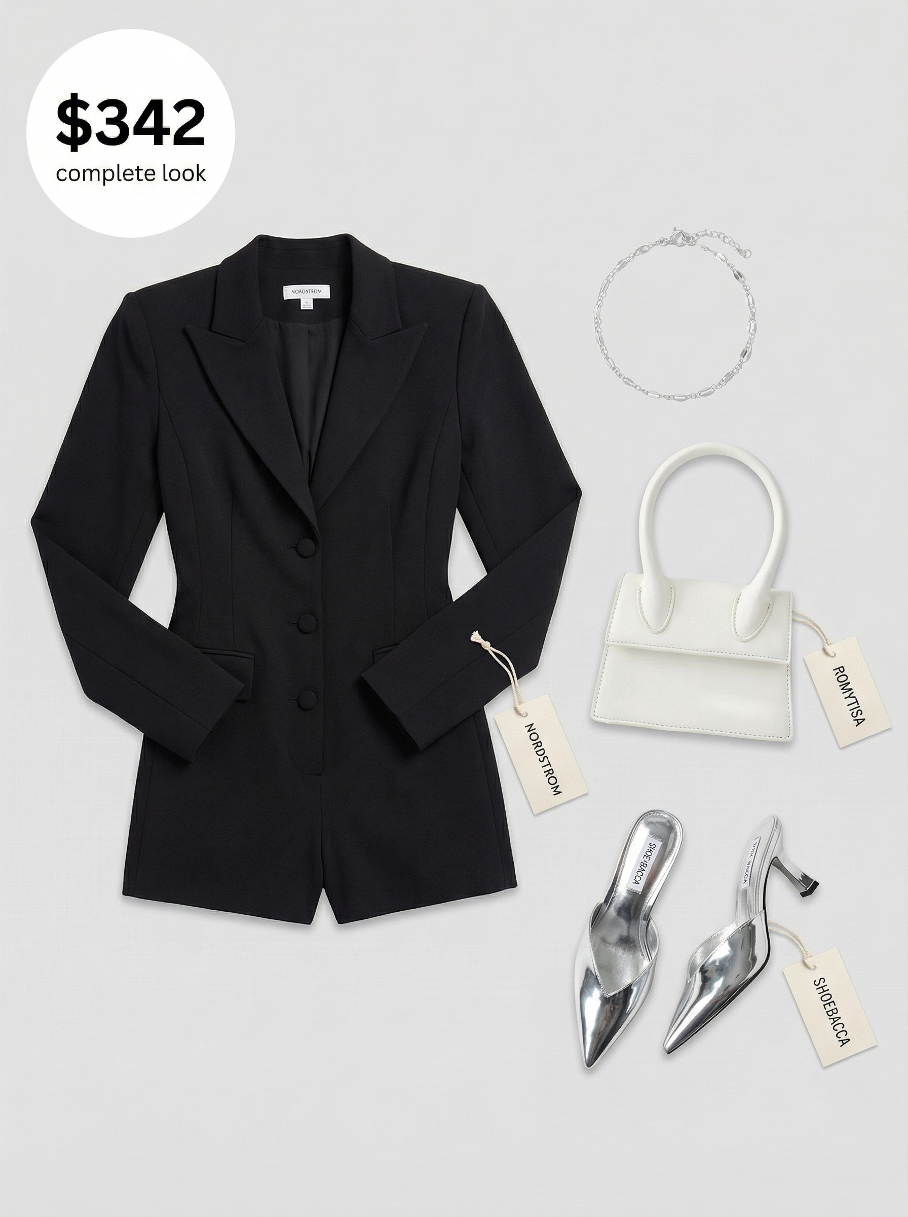 City-ready, truly. But for an evening event like a modern art gallery opening, a sharper aesthetic is required. This look is built around a single hero piece: a tailored black crepe romper ($172). Its structured blazer-like details elevate the silhouette from playful to sophisticated, making it ideal for a summer soiree. The outfit gets a glamorous, high-contrast lift from metallic silver faux leather mule shoes ($49.97), which add just the right amount of modern edge.
