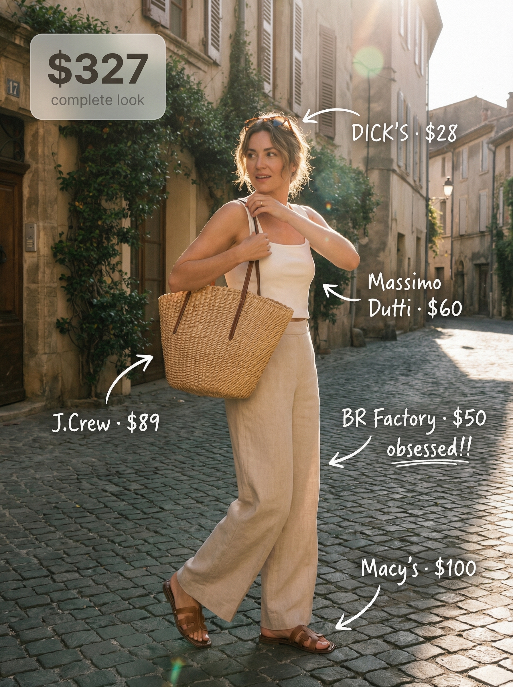 Our verdict is that this outfit perfectly captures a polished resort-wear vibe without feeling overworked. The neutral palette of crisp white and warm tan, accented with gold, is timelessly elegant. For a more relaxed feel, roll the shirt’s sleeves and leave it partially untucked. The combination is aspirational yet completely achievable, making it a prime candidate for your vacation-style Pinterest board.