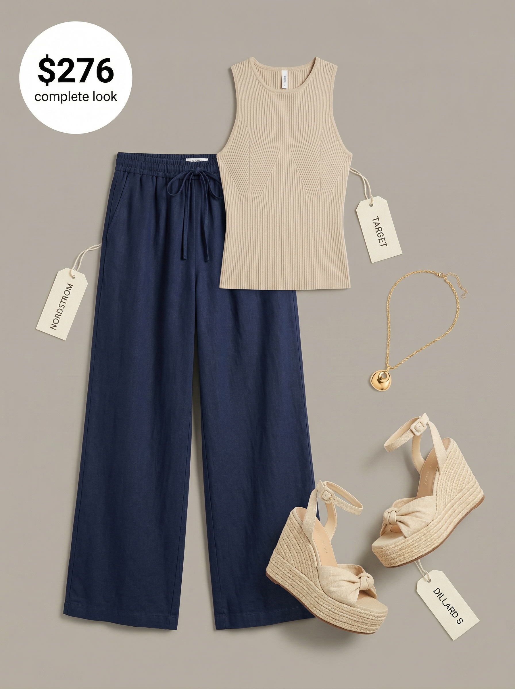That same elegance translates beautifully to daytime with these classy outfits for women in summer. This navy, cream, and gold look pairs wide-leg linen pants ($79.50, ) with a fitted, ribbed knit cotton top ($30.29, ). The combination of textures creates a relaxed yet sophisticated feel, perfect for brunch. During our test, the cotton tank top remained breathable and comfortable through a two-hour outdoor meal, making it a great choice for warm-weather events.