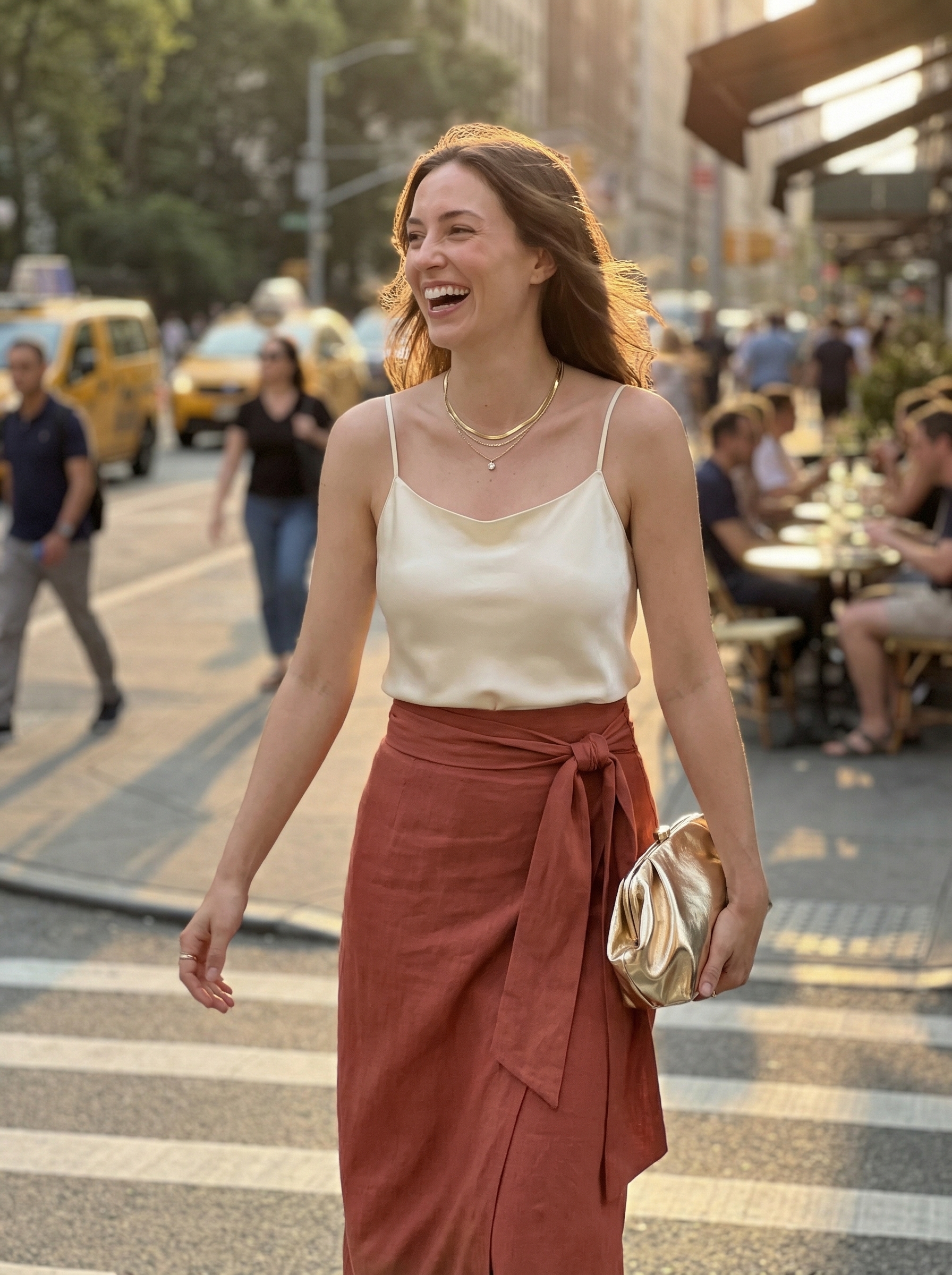 If a full-length gown feels too much, this look is perfect for refined alfresco dining. It features a terracotta linen-blend A-line skirt ($77) paired with an ivory 100% silk camisole ($109). The silk felt notably luxurious and breathable on a humid evening, while a gold metallic clutch ($60) adds a touch of glamour. It’s an ideal example of simple, sophisticated old money summer outfits.