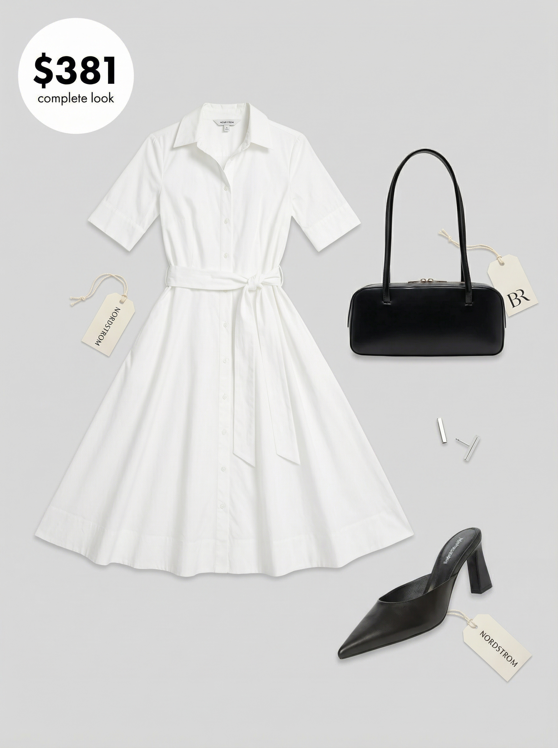 For a look that’s both intellectual and chic, this outfit pairs a crisp white cotton poplin shirtdress ($103.85) with sharp, pointed-toe black leather mules ($169.95). The architectural silhouette of the dress and the stark contrast of the accessories create a minimalist aesthetic that feels modern and clean, making it an excellent choice for a gallery visit or even some of the more polished, classy airport outfits the summer requires.