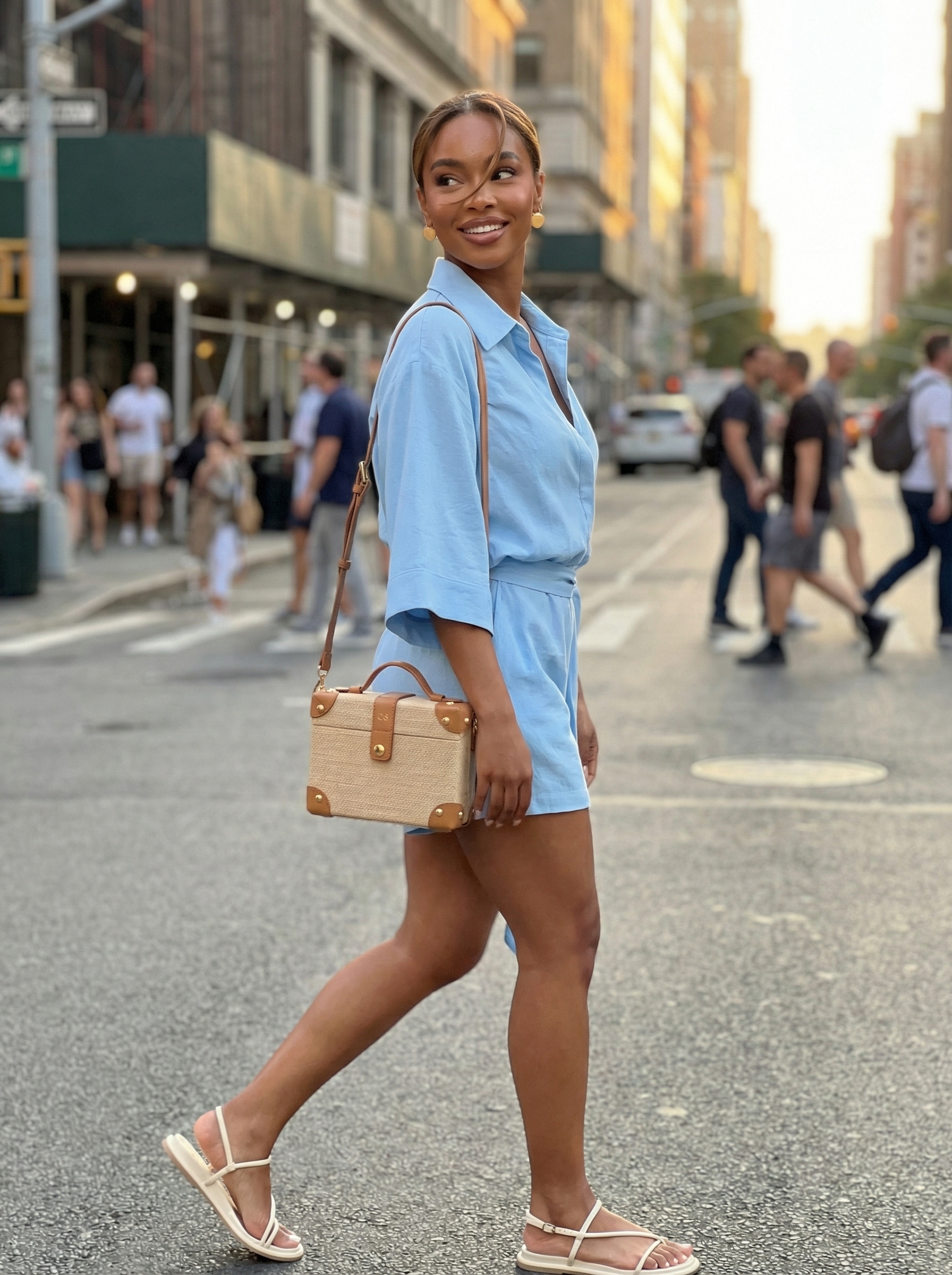 Surprisingly versatile, this sky blue look is one of those classy outfits for summer that transition seamlessly from day to night. The outfit’s hero is a tailored linen-blend romper ($20.99) featuring a polished collar and self-tie belt that elevates it beyond casual daywear. It pairs beautifully with clean white strappy sandals ($120) for a fresh contrast. Our honest take: while the pictured raffia bag is a chic accessory, be aware that its texture can snag on delicate fabrics like this linen blend.
