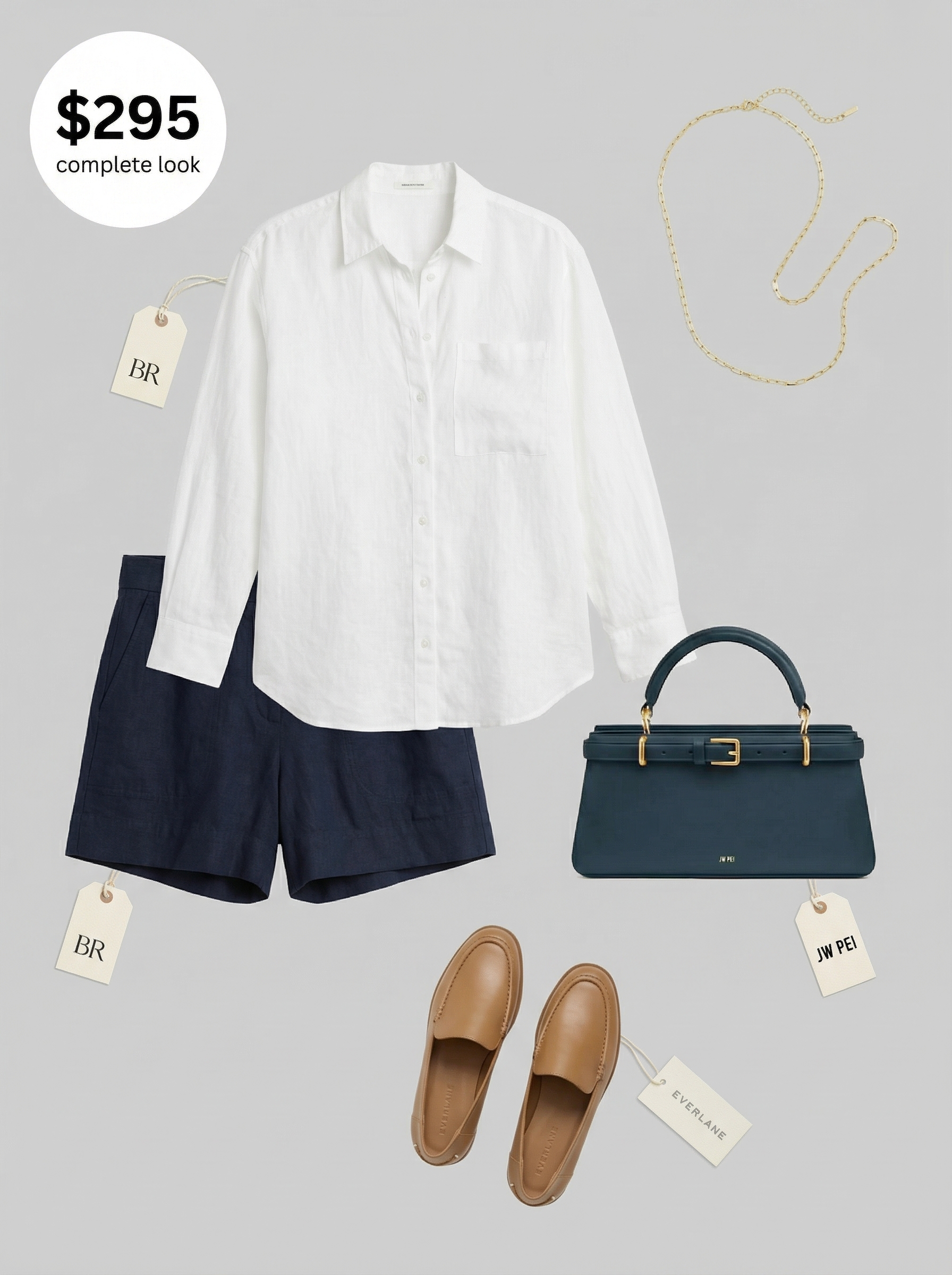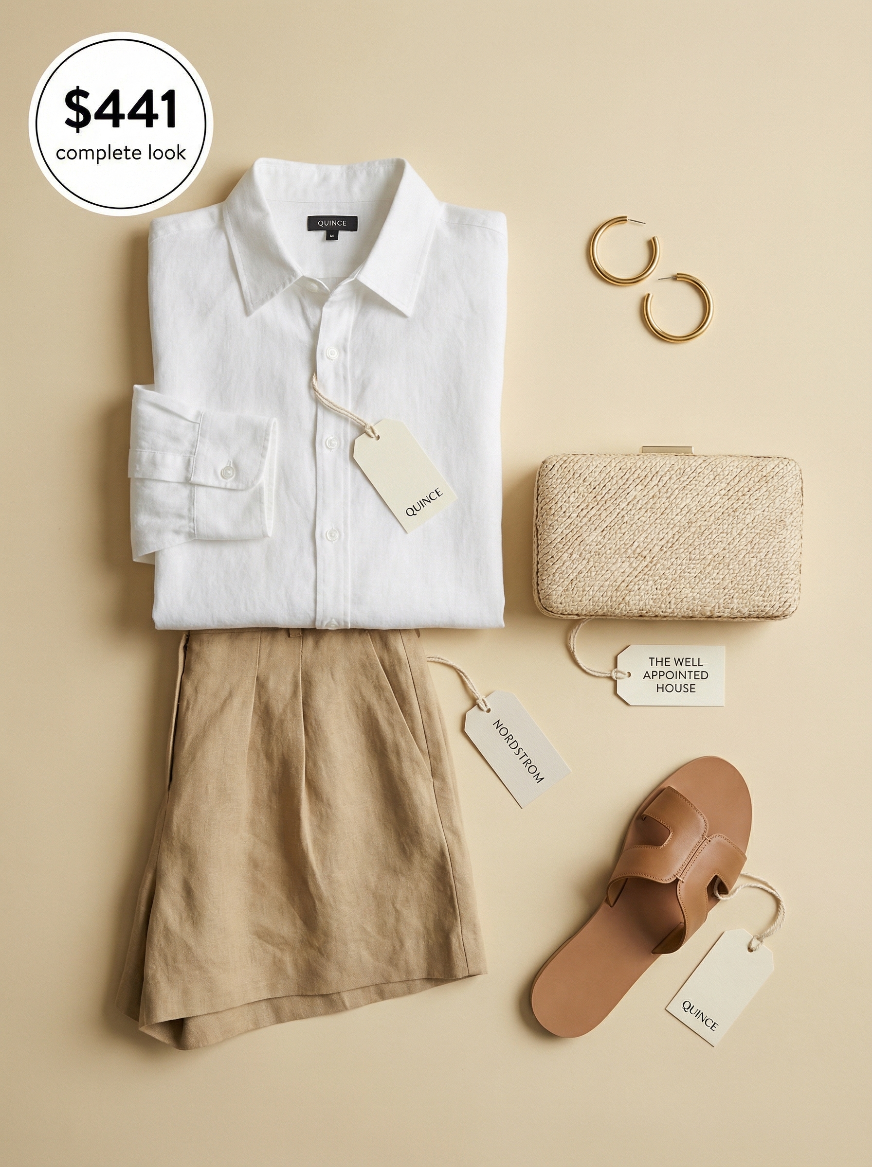 Speaking of the perfect vacation accessory, this entire look is a suitcase essential for a coastal dinner. The outfit’s foundation consists of tailored tan linen shorts ($89) paired with a crisp white oversized linen shirt ($42). The shorts’ linen blend offers a structured yet comfortable fit, while the top’s 100% European linen material gives it a light, airy feel ideal for a balmy evening. The polished tailoring of these pieces creates a sophisticated base that feels both effortless and chic.