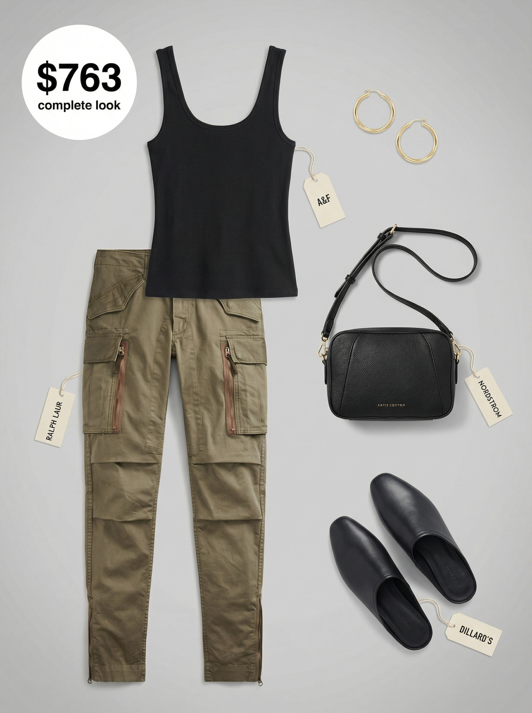 Transitioning from vacation ease, this city safari look offers an adventurous yet polished style. It pairs tailored khaki green stretch-cotton cargo pants ($345) with chic black flat leather mules ($199). Accessorized with simple gold hoops and a black tank, the look is a masterclass in elevating utility pieces, making it a standout among classy summer outfits that balance function and fashion.