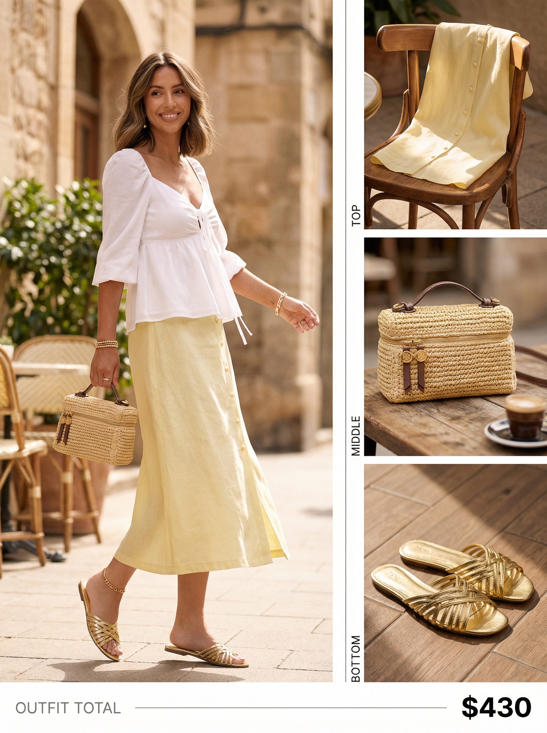 This outfit pairs a sunny yellow linen midi skirt ($34.99) with a romantic white puff-sleeve blouse for a truly joyful look. The skirt’s 100% linen fabric is exceptionally breathable for warm climates, while its elegant midi length offers a sophisticated silhouette. Accessories elevate the ensemble, including a structured woven straw bag ($295) with a leather top handle and glimmering gold accents, capturing a fresh aesthetic perfect for a vacation-day brunch.